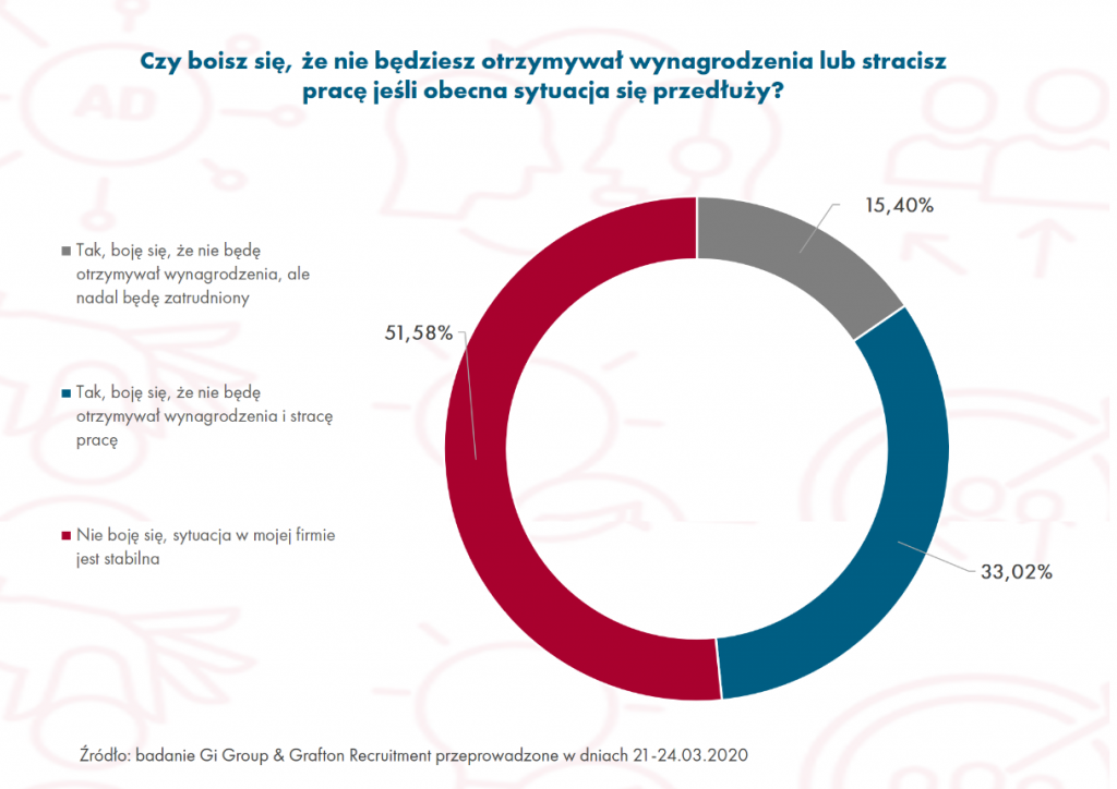 Czy będą wypłacane pensje? Czy utrzymam stanowisko pracy? Czy moja firma przetrwa? To dziś najważniejsze pytania, które zadają sobie pracownicy. W badaniu Gi Group i Grafton Recruitment, które przeprowadzono w dniach 21-24 marca, już prawie połowa pracowników tj. 48% obawia się, że nie otrzyma wynagrodzenia za pracę lub ją straci. 52% nadal jest spokojna o swoją przyszłość zawodową i deklaruje, że sytuacja w ich firmie jest stabilna.