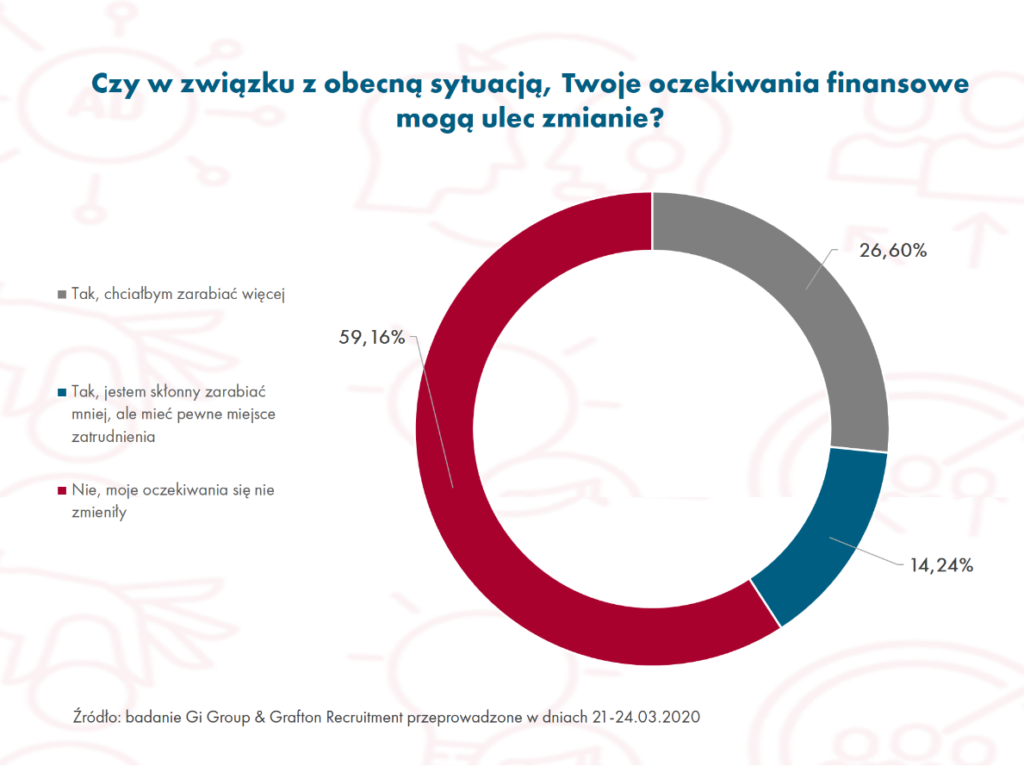 Jakie obawy mają i jak w obecnej sytuacji zachowują się menedżerowie? Połowa z nich (50%) pracuje obecnie zdalnie, 22% ciągle pozostaje w biurze. To największy odsetek w porównaniu z osobami zajmującymi niższe stanowiska w strukturze organizacyjnej. 38% menedżerów obawia się, że sytuacja kryzysowa sprawi, że stracą pracę, ale ok. 60% nowej jeszcze nie szuka. 60% zapytanych przez Gi Group i Grafton Recruitment twierdzi, że sytuacja kryzysowa nie wpłynęła na ich oczekiwania finansowe. 14% natomiast już jest skłonnych zgodzić się na obniżkę pensji, aby zachować pracę. Co ciekawe 26% deklaruje, że chce w obecnej sytuacji zarabiać więcej.